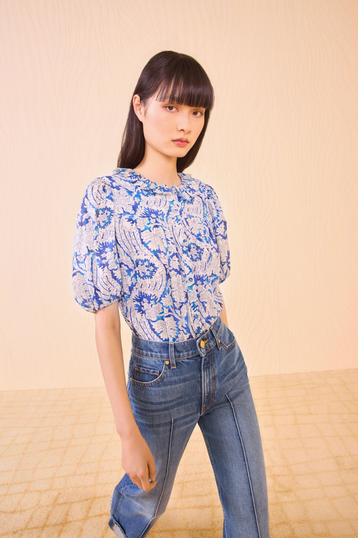 Drawing inspiration from a vintage indigo panel, the Amari Blouse is made from softly striped cotton-blend printed with bold, graphic botanicals. This multicolored top is gently puffed at the short sleeves, while the ruffled collar adds a playful touch. It fastens with tonal buttons through the front.