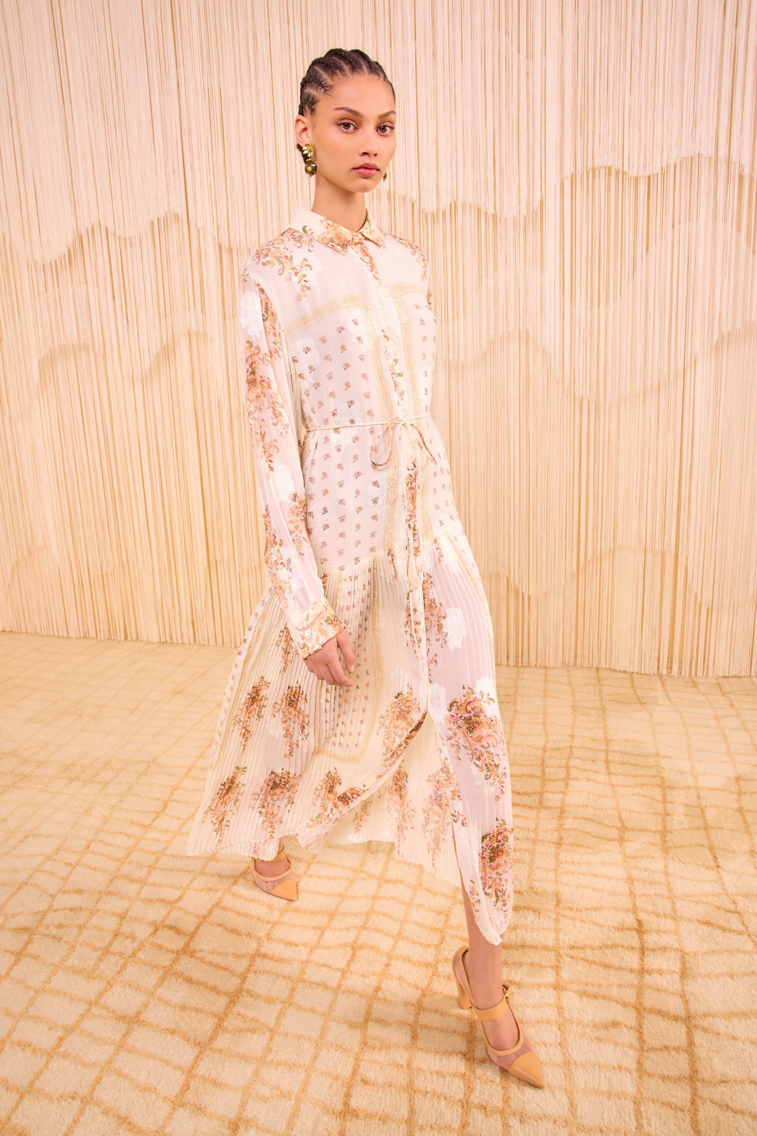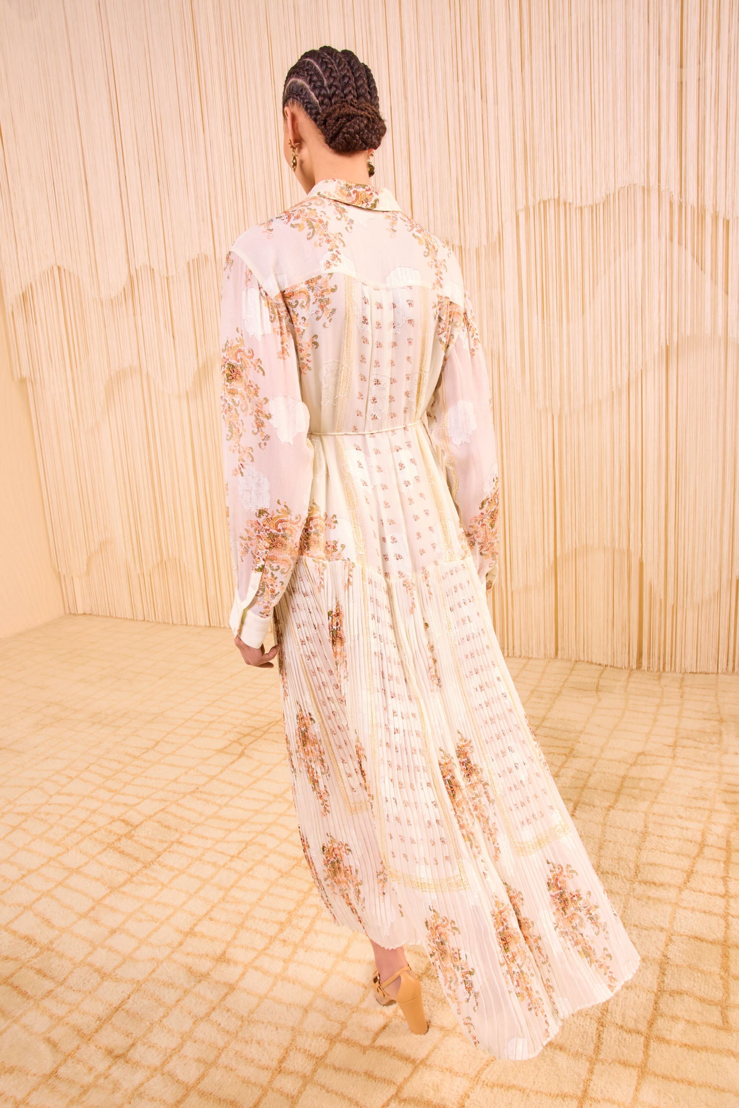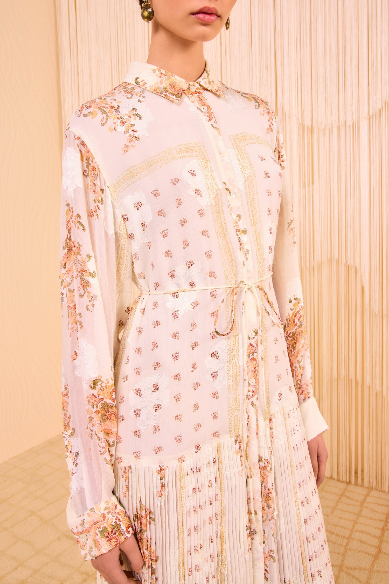 The Emilie Dress combines a classic shirt silhouette with the beauty of chiffon jacquard, featuring a floral scarf print layered over fil coup¨¦ for an ethereal finish. This soft white midi dress has long sleeves with buttoned cuffs and is constructed with sharp pleats at the skirt for poetic movement. It has a removable waist tie that tempers the silhouette and fastens with buttons through the front.